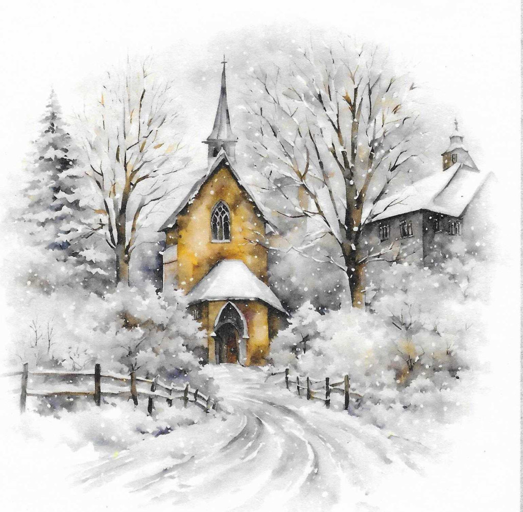 Téli tájkép, karácsony, templom