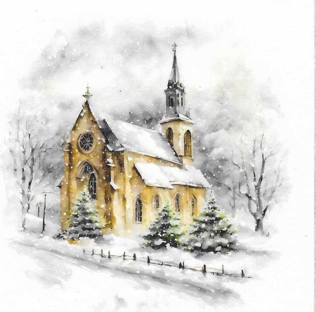 Téli tájkép, karácsony, templom