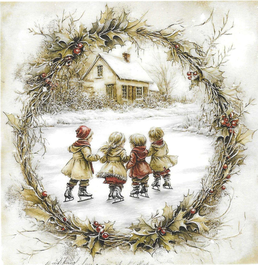 Téli tájkép, karácsony, koszorú, gyerekek, nosztalgia képek