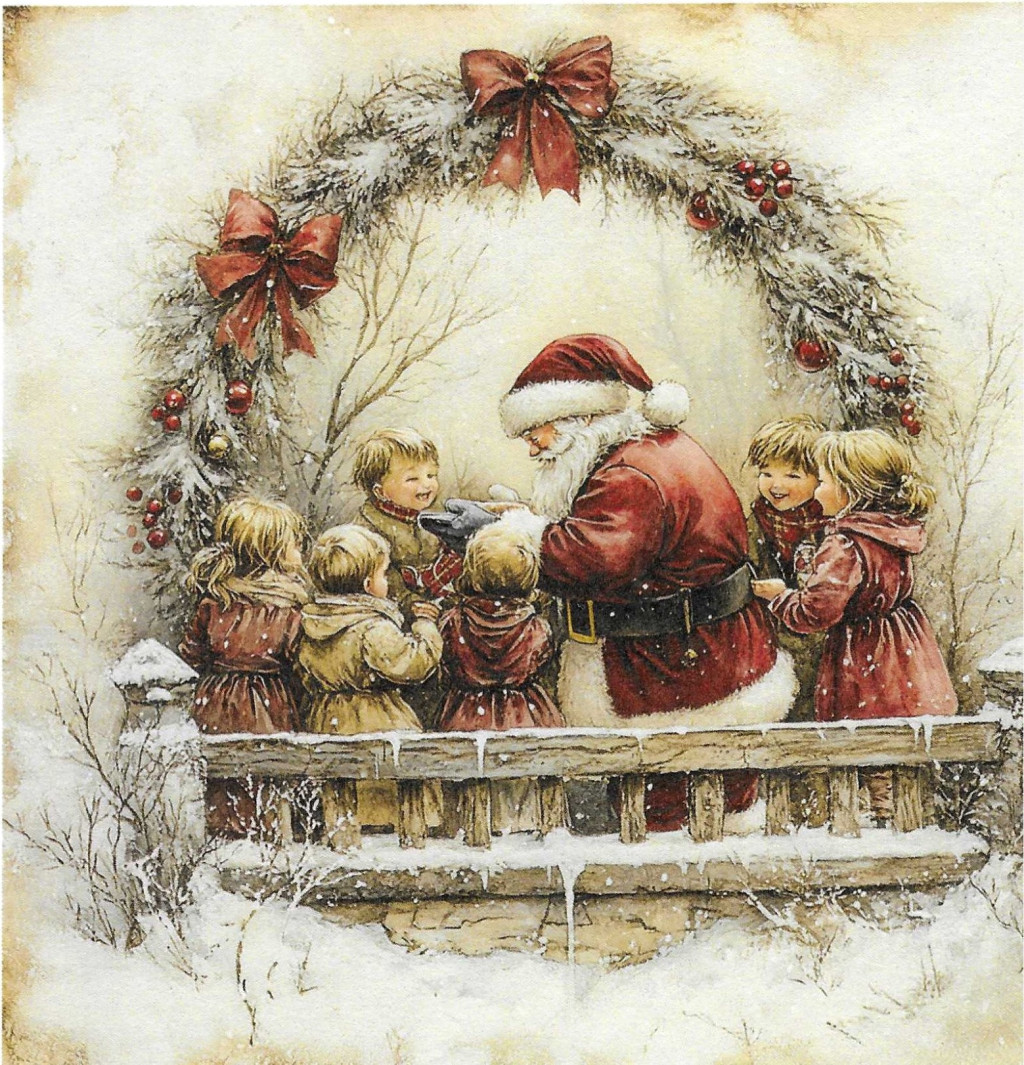 Téli tájkép, karácsony, koszorú, gyerekek, Mikulás, nosztalgia képek