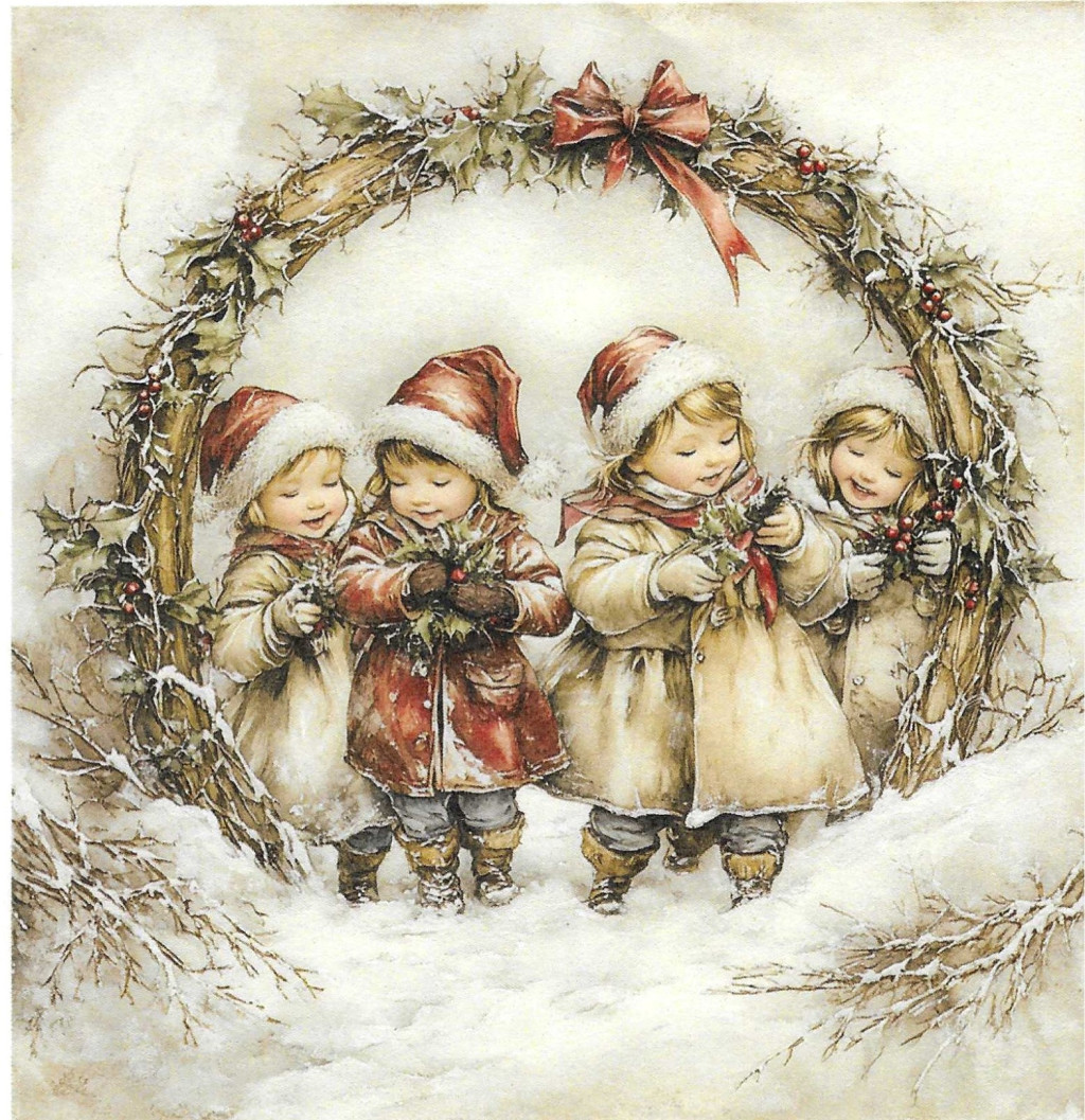 Téli tájkép, karácsony, koszorú, gyerekek, nosztalgia képek