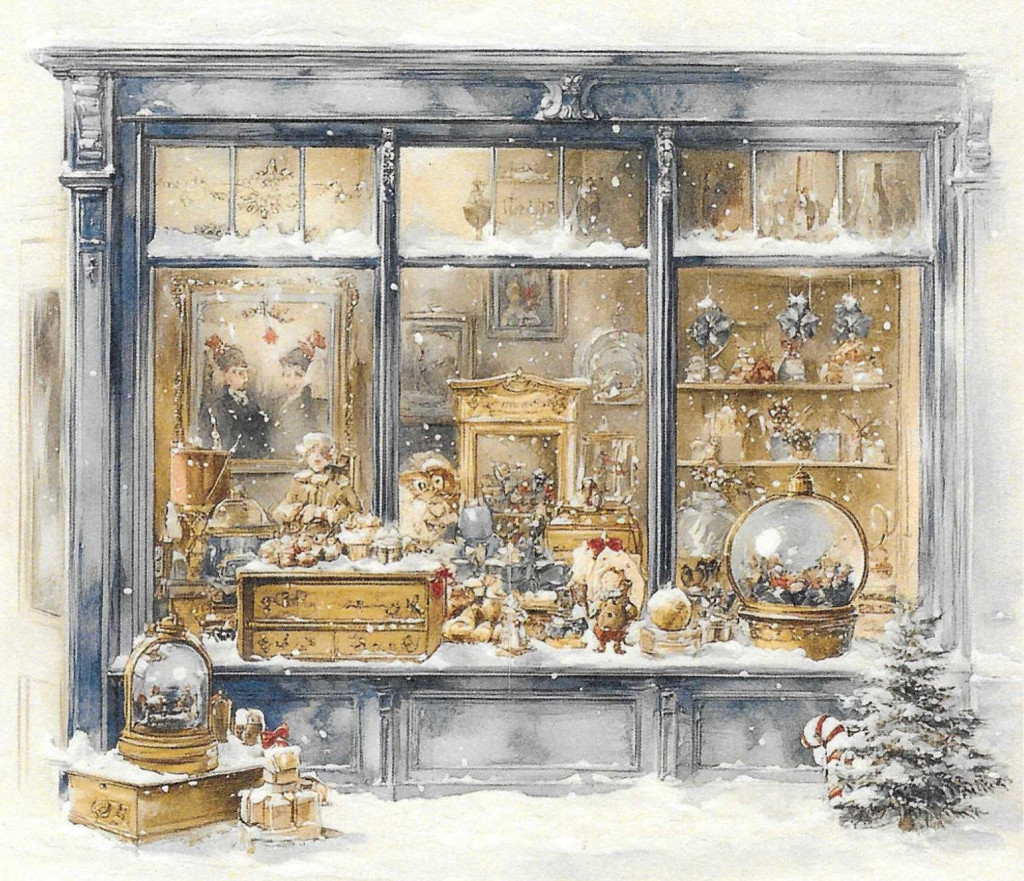 Téli tájkép, karácsony, játék üzlet, nosztalgia képek