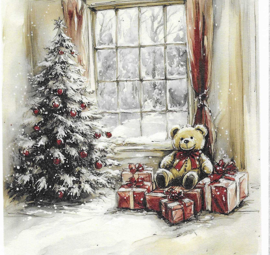 Téli tájkép, karácsony, ajándékok, játékok, nosztalgia képek