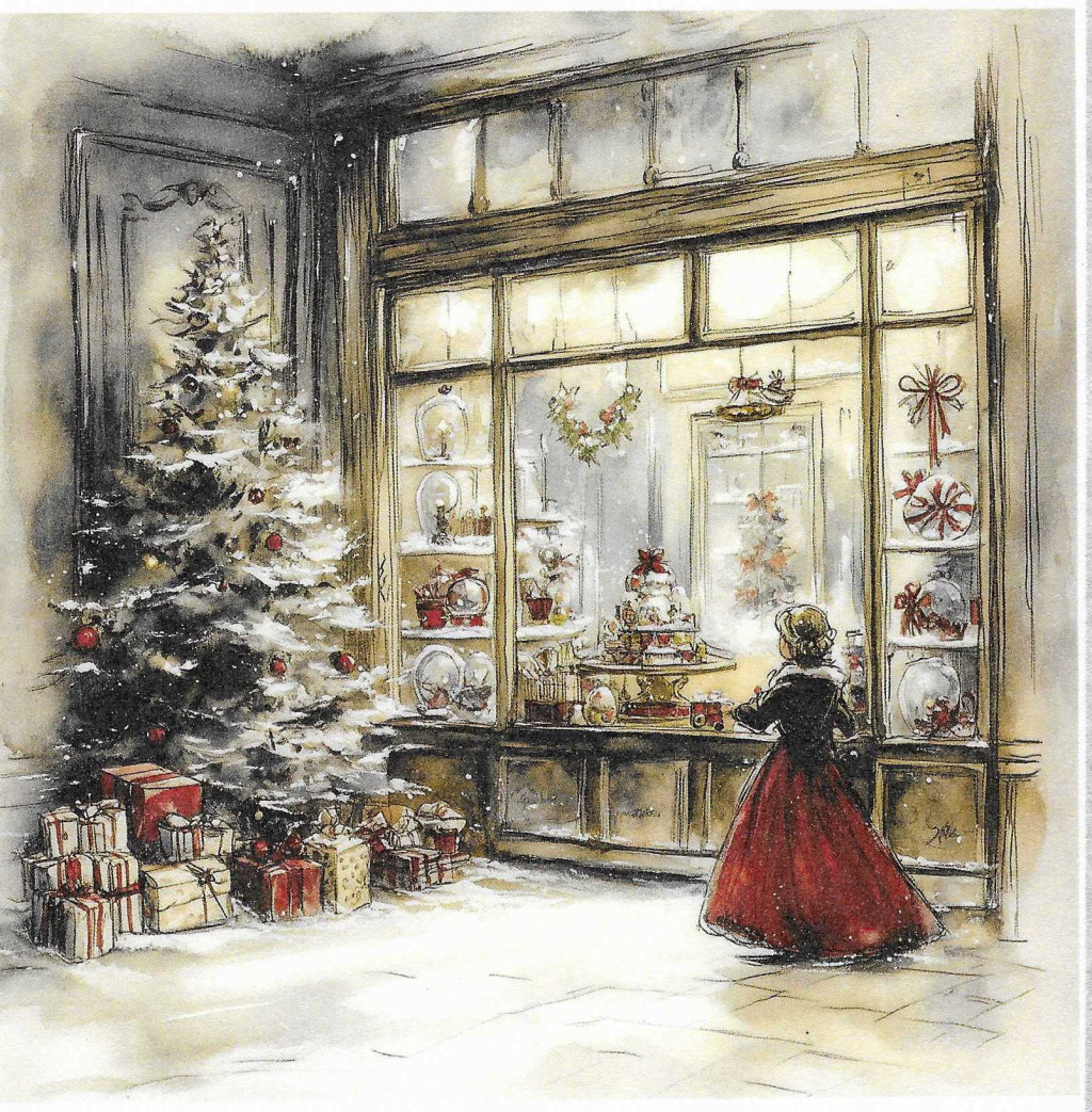 Téli tájkép, karácsony, játék üzlet, nosztalgia képek